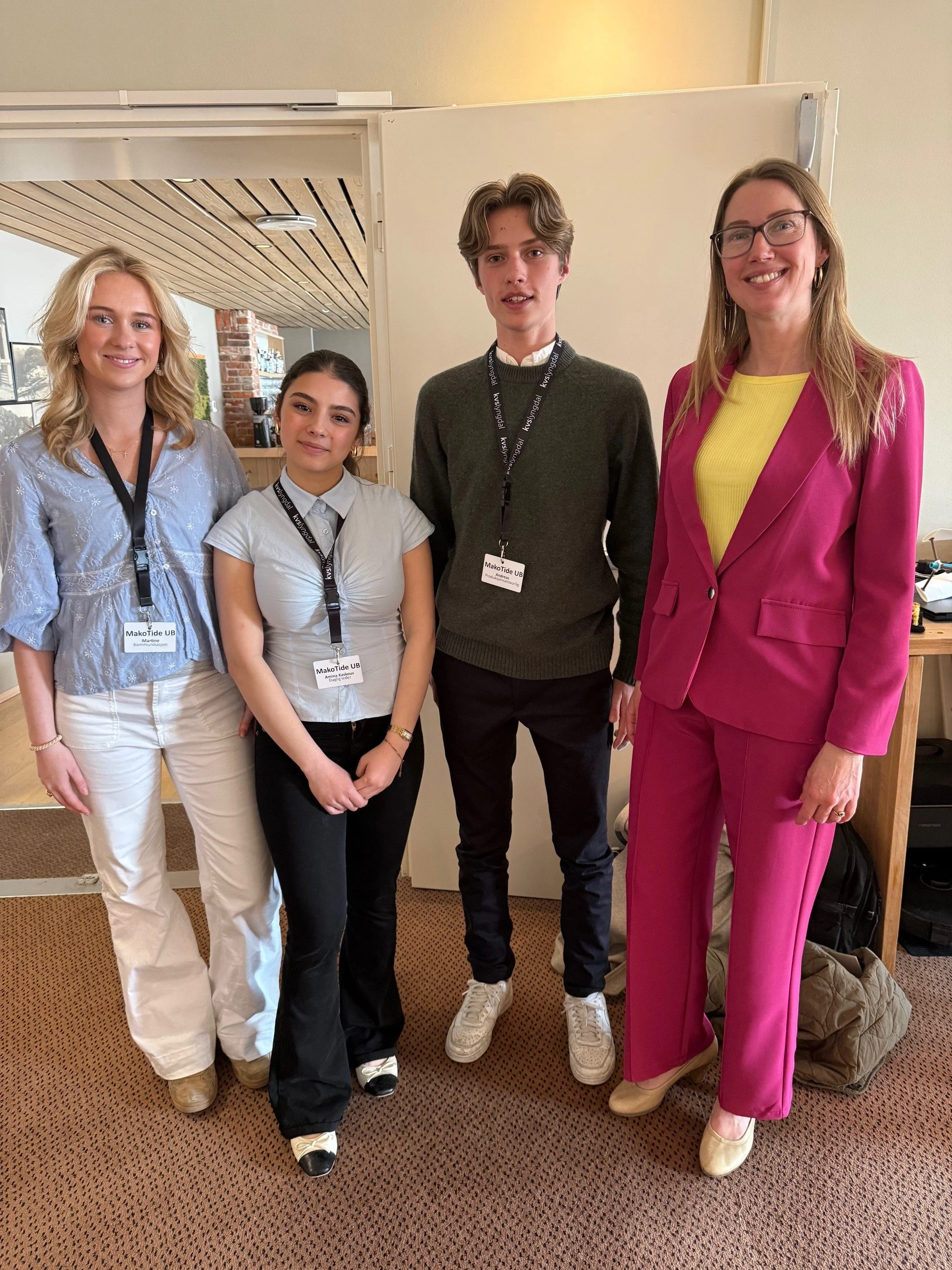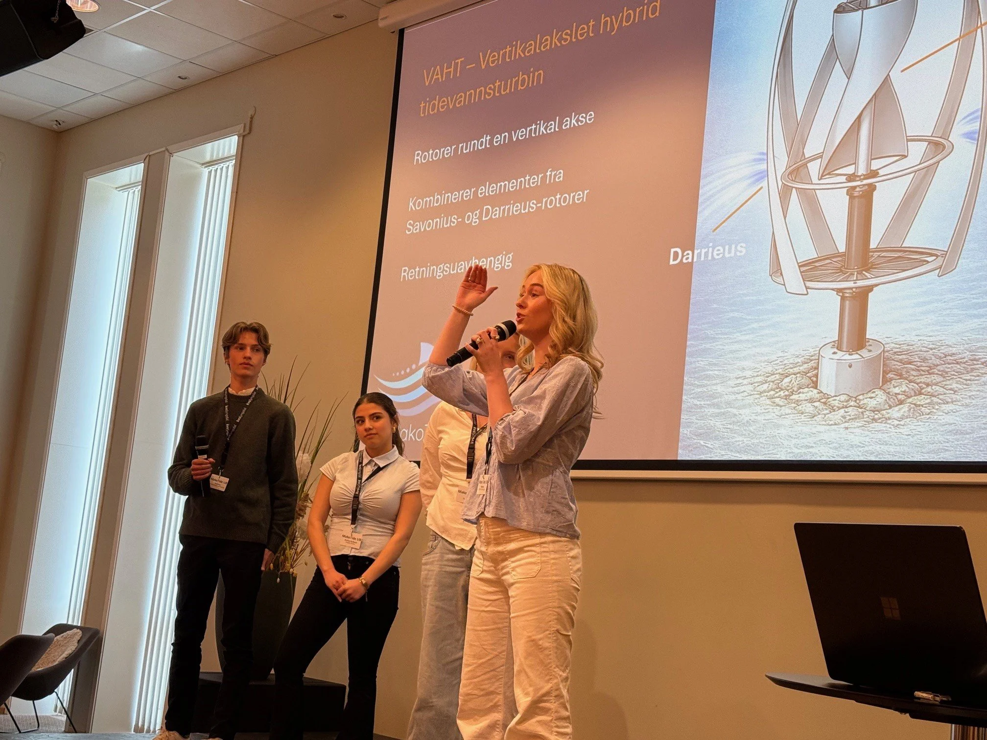 Makotide, ungdomsbedriften fra KVS Lyngdal som vant fylkesmesterskapet i konkurranse med 95 andre bedrifter, vakte oppsikt med en løsning som kan gjøre tidevannsenergi både billigere og mer tilgjengelig. De unge gründerne har utviklet en turbin de mener kan åpne for en ny måte å hente ut ren energi på. Her med daglig leder i Lister Nyskaping, Anne Vigdis Ellingsen.