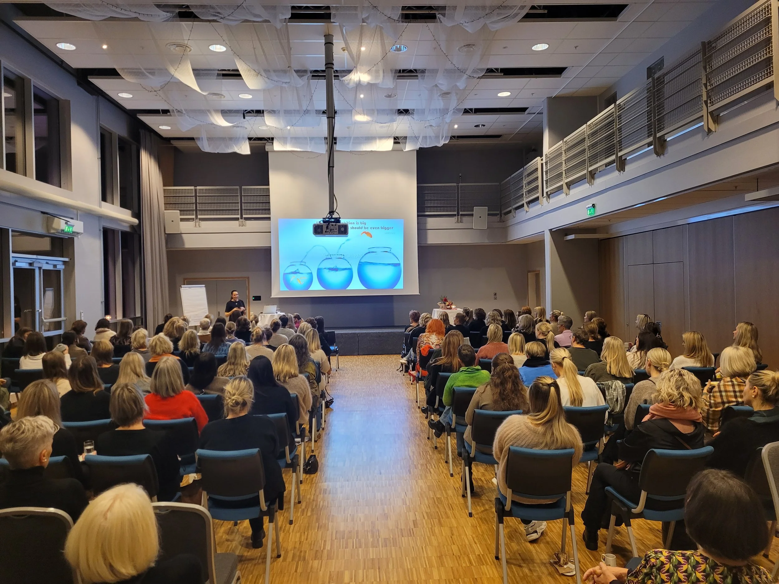 Fullsatt sal med over 200 kvinner fra hele regionen under Kvinnespranget 2023 på Utsikten Hotell.